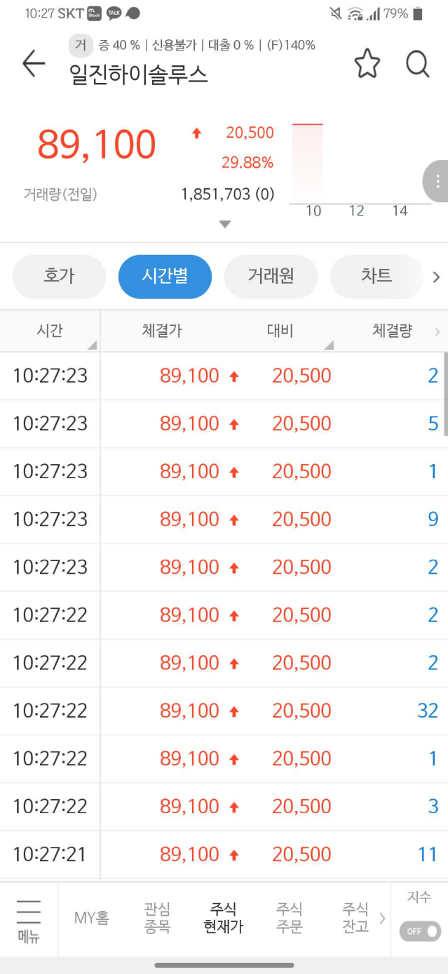 시장에서 예상한 것과 같이 시초가부터 바로 상한가 가격인 89,100원으로 시작을 했습니다. 20,500원 상승한 가격인 것이죠. 공모가 기준으로 엄청난 수익을 본 것입니다.
